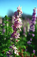 One of the most spectacular reseeding annuals is larkspur. Larkspur, Consolida ambigua, is known for its tall spikes of blue, lavender, purple, pink or white flowers. Bicolor flowers occur occasionally as well. Both single and double flower forms exist. The double flower has been preferred because of the larger bloom which is showier in a cutflower or dried arrangement. However, the single flowered version has a uniqueness and "animal magnetism" which make it much more intriguing than its bigger blooming sister.
