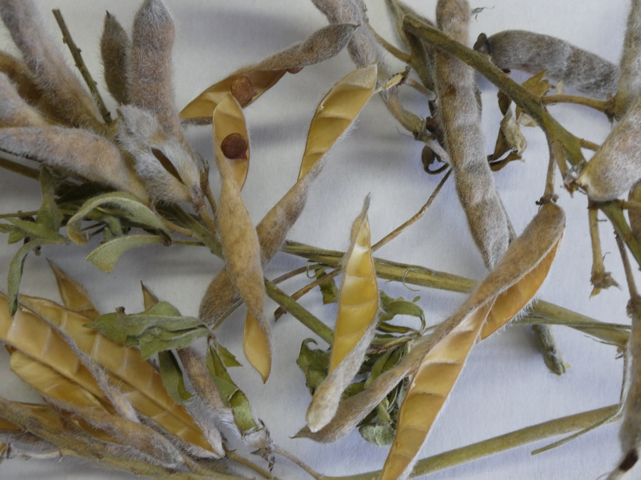 Bluebonnet dried pods with multiple seed in popped hulls.
