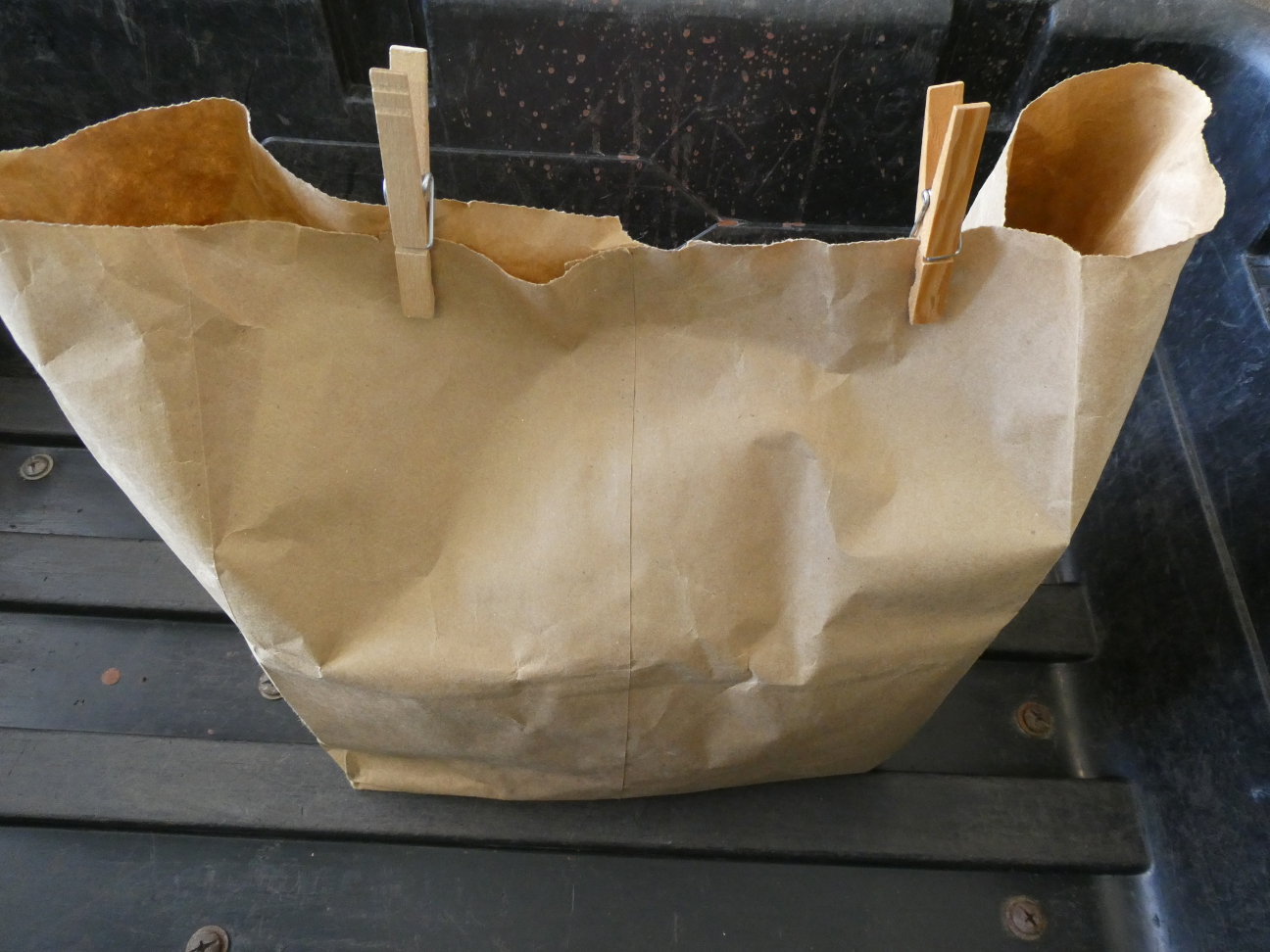 When harvesting the seed, either cut the dark yellow and brown ones as they turn color over time leaving as much stem as you can, or pull the entire plant, and place them in items such as a larger grocery bag (paper or I have even used the reusable polypropylene bags you buy at the store) and pin a couple clothes pins at the top to keep seeds from jumping out of the top of the bag leaving some openings at the top for air circulation. Placing the bags in full sun is desirable versus no sun as they will mold.