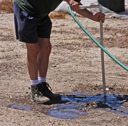 The water moistens the hard soil while the pressure flow pentrates as nozzle moves downward.