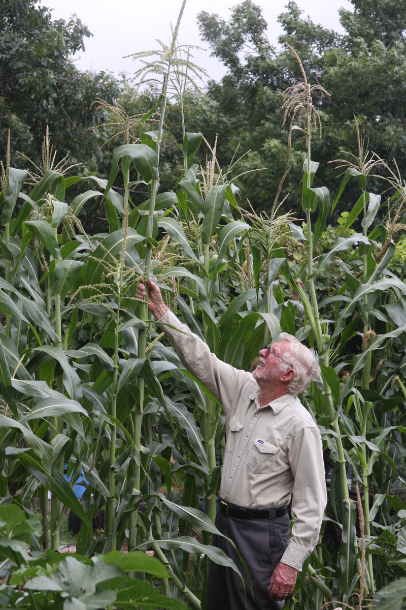 Malcolm with wife, Delphine, by TALL corn he developed at Gardenville