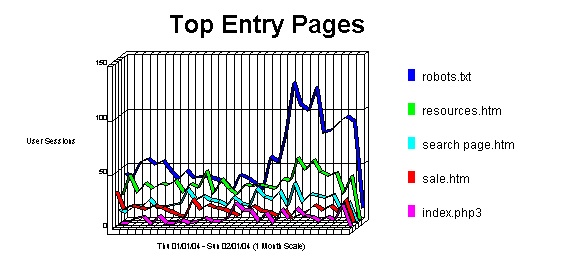 This section identifies the first page viewed when a user visits this site. This is most likely your home page but, in some cases, it may also be specific URLs that users enter to access a particular page directly. The percentages refer to the total number of user sessions that started with a valid Document Type. If the session started on a document with a different type (such as a graphic or sound file), the file is not counted as an Entry Page, and the session is not counted in the total.