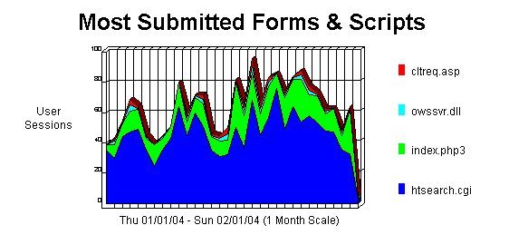 This section identifies the most popular forms or scripts executed by your server. WebTrends counts any line with a Post command or a Get command with a "?" as a form or script, and shows only successful hits.