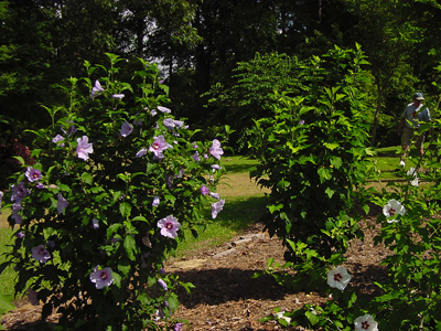 Greg with 4-years-to-bloom althea (on the right) by 'Blue Angel' (full of bloom on the left)!!!