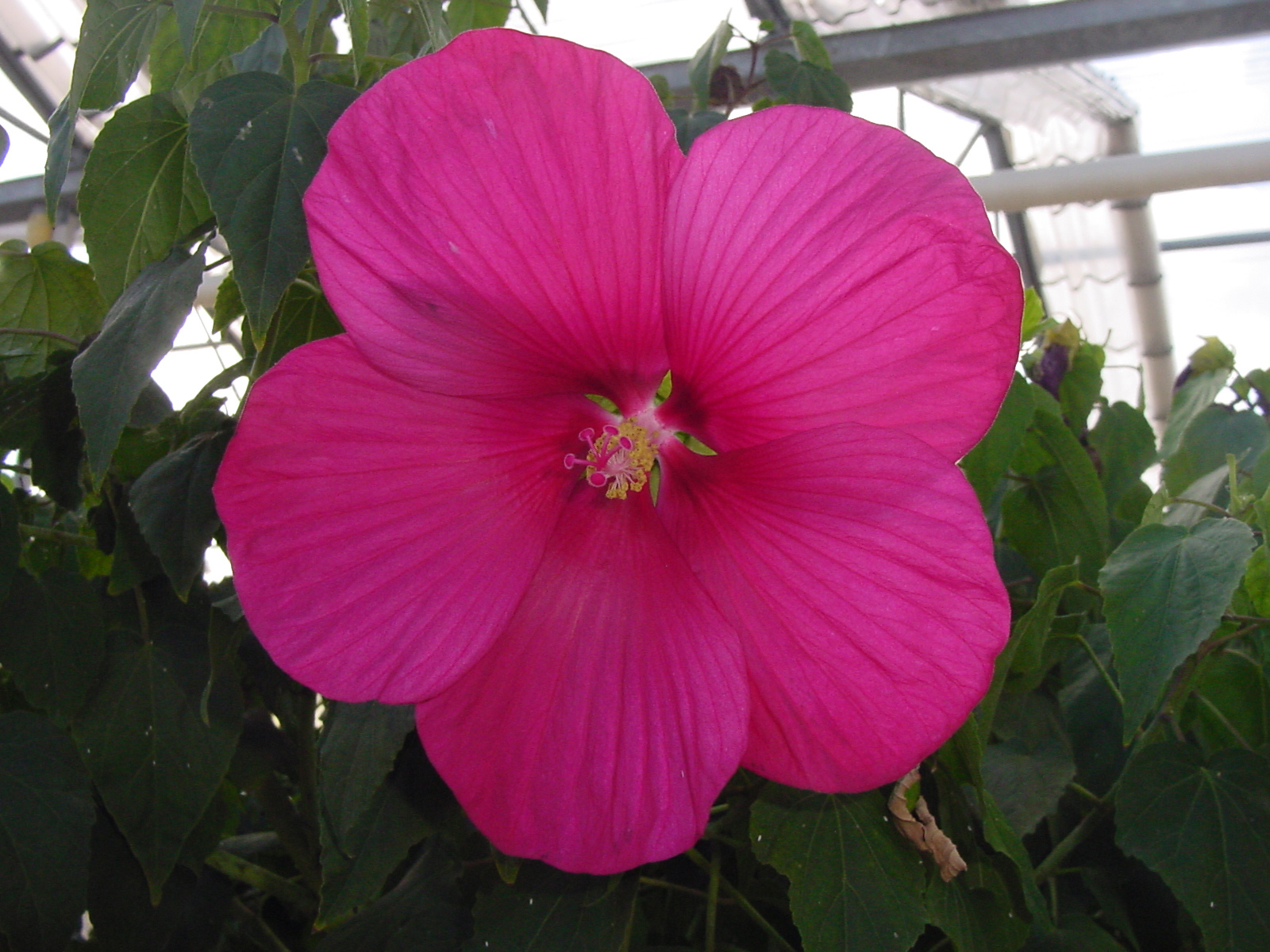 'Flare' is a selection, developed by Dr. Sam McFadden of Somerville, Tennessee. This showy perennial has large glowing (the name 'Flare' was used by the breeder to closely depict the color of this flower, i.e., the color of a burning flare), fuchsia flowers. The maple-like emerald green foliage is very attractive on a compact plant. He crossed H. mouchetus ('Brilliant Cerise' and 'Clown (a California source) x H. mouchetus seedlings. He said that Flare is a carbon-copy of 'Brilliant Cerise' but the Flare seedling was chosen for compactness of growth and dark green color -- Dr. McFadden made a pretty good call! Zone 5-10.