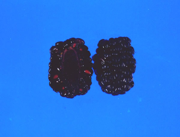 Purplish red fruit with amber yellow flesh; large, sweet,
