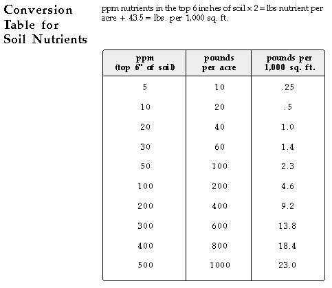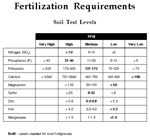 Total fertilizer nutrients needed by turfgrasses assuming all clippings are removed may be calculated by substracting the soil levels reported from the total needed. For example, a bermudagrass turf on a soil with 10 ppm (@ .5 lbs. per 1,000 sq. ft.) phosphorus needs an additional 2 pounds per 1,000 sq. ft. of phosphorus during the growing season. Likewise, if the soil was reported to contain 120 ppm (5.5 lbs. per 1,000 sq. ft.) potassium, an additional 2.2 lbs. per 1,000 sq. ft. would be needed during the growing season. However, if the soil was reported to contain 175 ppm or more potassium, additional potassium would not be needed.