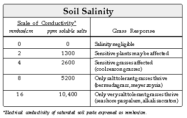 Soils which have high enough levels of soluble salts to effect plant growth are classified as saline soils. Saline soils may be recognized by white crusts on high spots, stunted plants or spotty stands of grass, but these symptoms are not always obvious. In South Texas and throughout the southwestern U.S., saline soils are a significant problem on irrigated sites. In most cases, these problems are increased by poor quality irrigation water. Generally, warm season turfgrasses are quite tolerant to soluble salts. Bermudagrass, for example, tolerates 4,500 ppm or more soluble salts in the soil without apparent injury; whereas, cool season grasses such as tall fescue may be severely injured by only 2,500 ppm soluble salts. Even within turfgrass species, significant differences are found in tolerance to salts. For example, Santa Ana bermudagrass tolerates much higher salt levels than common bermudagrass. However, plant response to soluble salts is greatly influenced by environmental conditions and mangement practices.