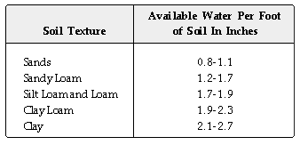 From the above table, 12 inches of a sandy loam soil would hold approximately 1.5 inches of available water following irrigation. During the summer this amount of water would be gone in 5 to 6 days. To effectively leach salts below the 12 inch rootzone, 1.5 inch of water plus 23% of 1.5 inch, or 1.85 inch, should be applied during the next irrigation. If the lawn is irrigated every other day, 0.62 inches of water is needed (.5 inch replacement water plus 0.12 inch (23%) of "extra" water.