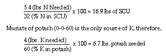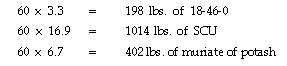 Remember, the 18-46-0 fertilizer provides 18% nitrogen in addition of 46% phosphorus. Thus, 3.3 lbs. of 18-46-0 fertilizer provides 0.6 lbs. (3.3 x 18/100) of nitrogen. The remaining nitrogen (6-0.6), or 5.4 lbs., must be provided by sulfur coated urea.